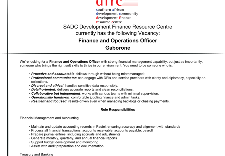 The SADC-DFRC is looking for a Finance and Operations Officer with strong financial management capability, but just as importantly, someone who brings the right soft skills to thrive in our environment. You need to be someone who is: Proactive and accountable: follows through without being micromanaged; Professional communicator: can engage with DFIs and service providers with […]